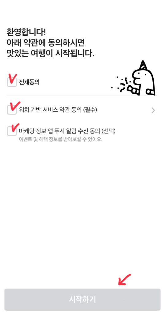 アプリを初めて開くと下記の画面が表示されます。全てにチェックをして1番下のボタン(矢印つけてるところ)を押す。チェック入れると押せるようになります。