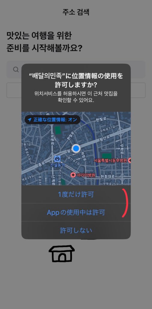 位置情報許可するかの確認画面が出るので、1度だけ許可またはAppの使用中は許可を押してください。