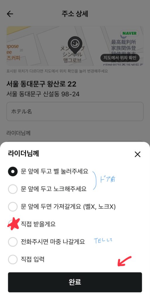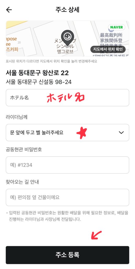 1番上にホテル名(英語か韓国語)を入れます。その下(赤星のところ)配達員さんへ受取方法の希望を伝える場所です。次の画像で説明します。