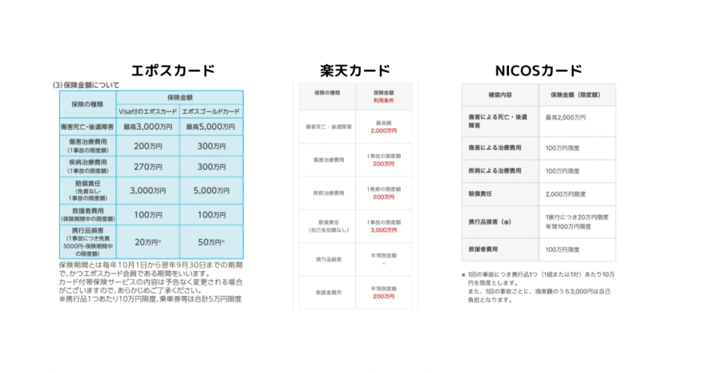 傷害死亡・後遺障害の最高金額がエポスカードが3,000万円で楽天カードとNICOSカードが2,000万円です。エポスカードが最も大きいです。その他の項目でもエポスカードの金額が上回るか、他のカードと同一金額が限度となっています。