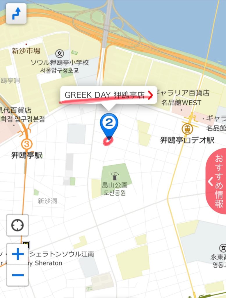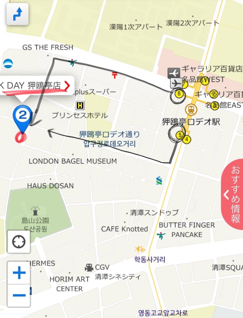 場所は3号線の狎鴎亭駅と水仁盆唐線の狎鴎亭ロデオ駅の間くらいにあるので、どちらの駅からも歩いて行けます。