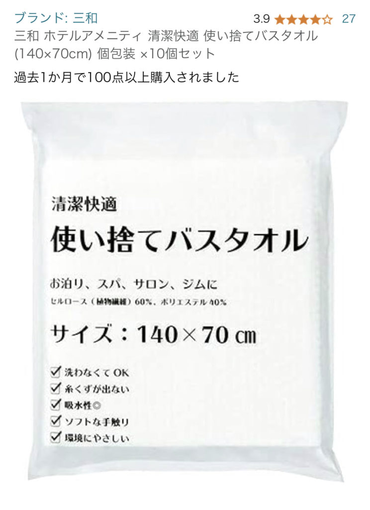 ちなみに使い捨てバスタオルですが1枚で2.3回くらいなら使えます。※毎回使用後にちゃんと干した場合