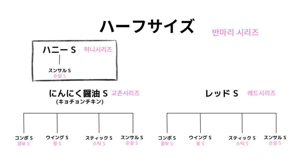 醤油(カンジャンチキン)とレッドはオリジナル以外の部位が選択できますが、ハニーシリーズはハーフサイズだとスンサル(骨なし)しか注文できません。