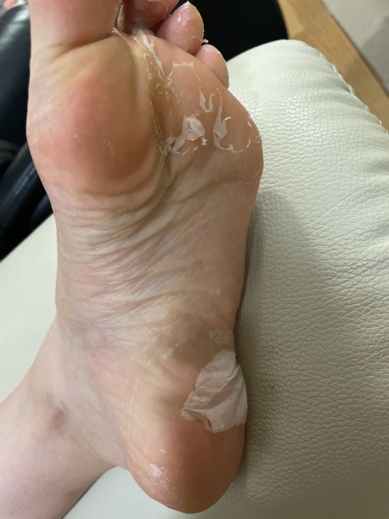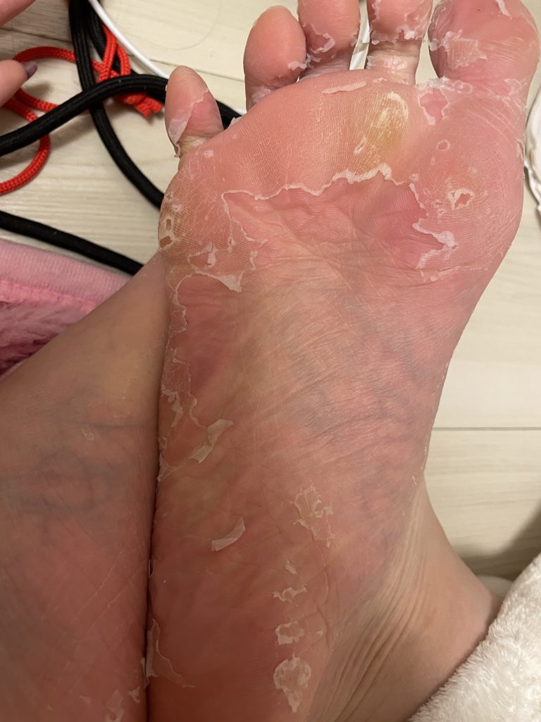 足のサイズが大きい人は足の裏しか剥けませんが、足のサイズがそこまで大きくない人は足の表側にも液が付くので皮が剥けました。